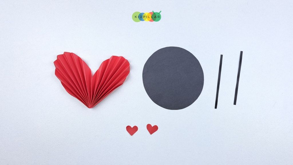 Step 8: Paste the accordion heart on the black circle. Next, make two eyes for the ladybird craft by pasting black circle on white circle. Cut out small black hearts for the spots on the ladybird’s body.