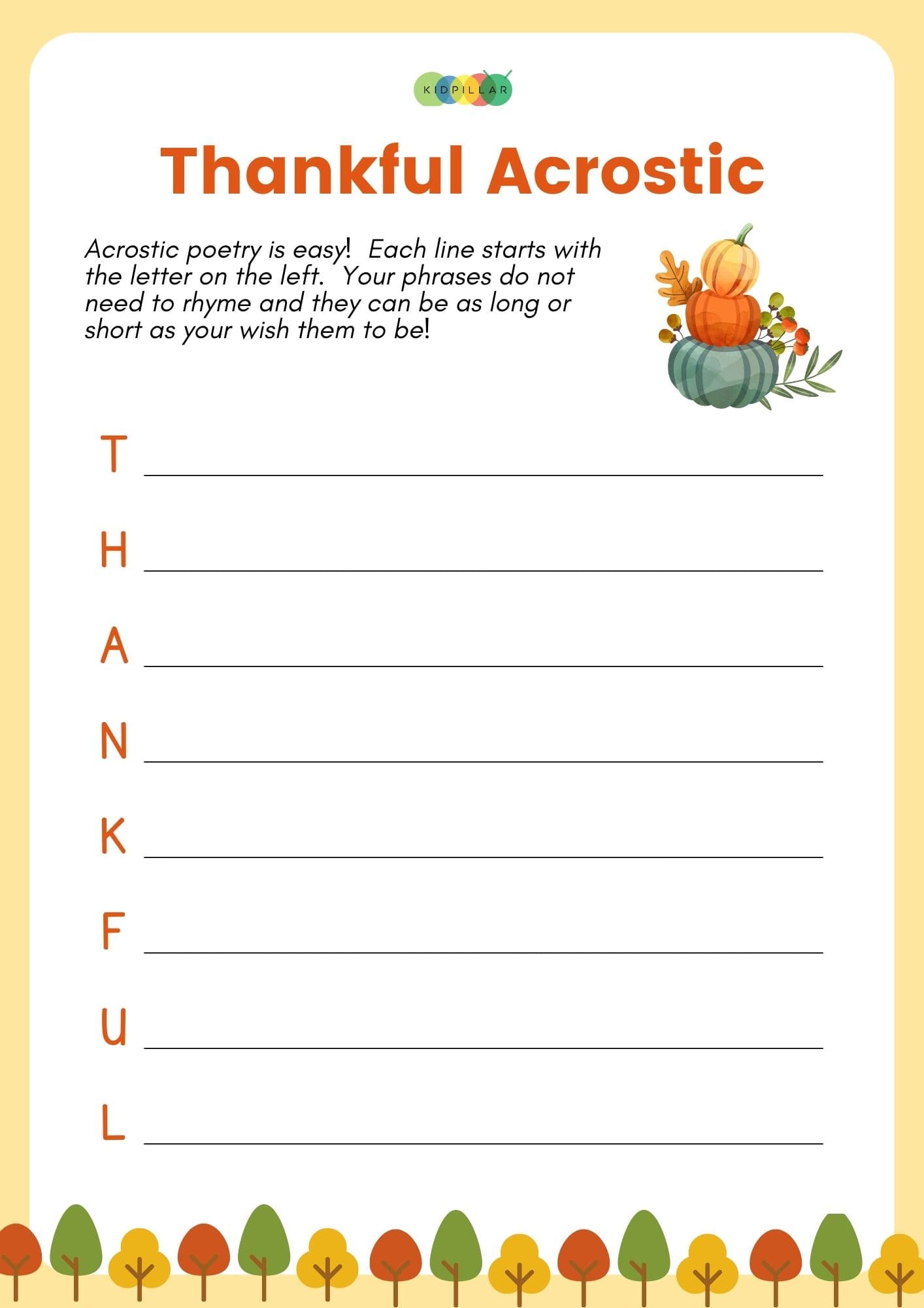 Make it into a fun thanksgiving activity for the family with this free printable and let everyone read out aloud his or her acrostic poems post thanksgiving dinner.