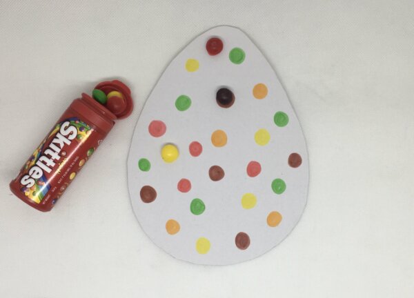 Cut out a big Easter egg from a white sheet of paper and add colored dots, in the same color as skittles, onto the egg using dot-to-dot markers.
